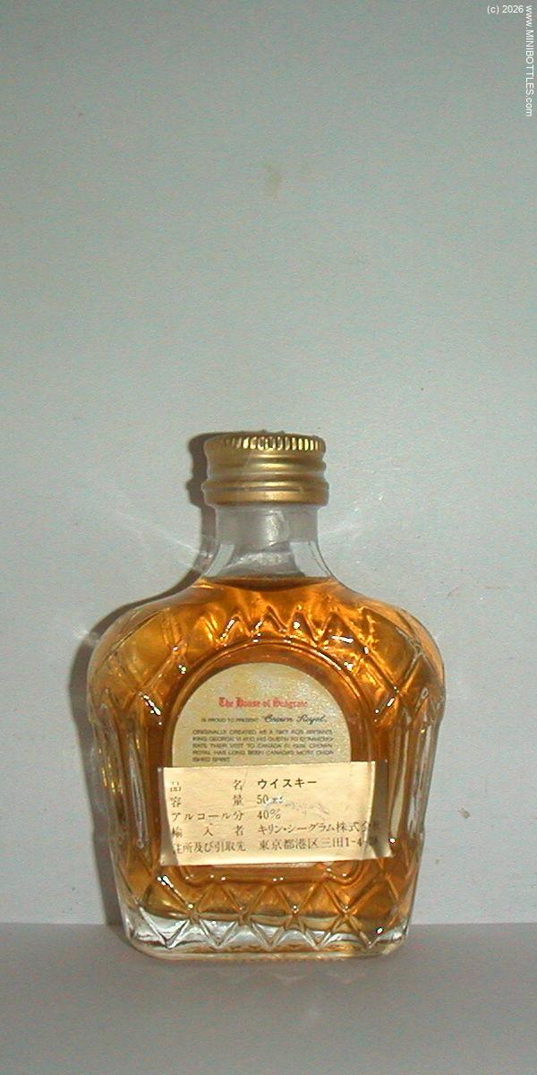 | Seagram's Crown Royal Blended CW | | Manufacturer: | Seagram | City / State: Country: Continent: | Waterloo / Ontario Canada (CA) America |  | Age On Label: Alcohol: Content: | Unknown 40.00 % Vol. 5.00 cl | Bottle Style: Import: Whisk(e)y: | clear/other/PET Import (US) CW - Canadian Whisky