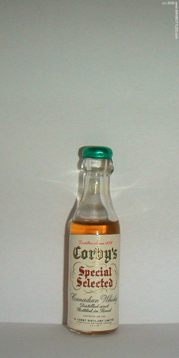 | Corby's Special Selected Canadian Whiskey | | Manufacturer: | Corby Dist. | City / State: Country: Continent: | Coryville / Ontario Canada (CA) America |  | Age On Label: Alcohol: Content: | Unknown Unknown 2.00 cl | Bottle Style: Import: Whisk(e)y: | clear/round/- Original CW - Canadian Whiskey