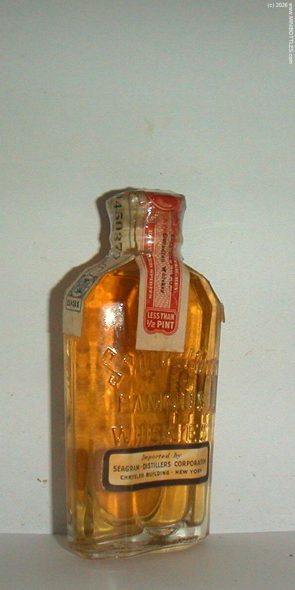 | Seagram's Ancient Bottle Straight Rye Whiskey | | Manufacturer: | Joseph E. Seagram & Sons | City / State: Country: Continent: | Waterloo / Ontario Canada (CA) America |  | Age On Label: Alcohol: Content: | 5 years 50.00 % Vol. 5.00 cl | Bottle Style: Import: Whisk(e)y: | clear/quadrangular/- Import (US) RW - Rye Whiskey