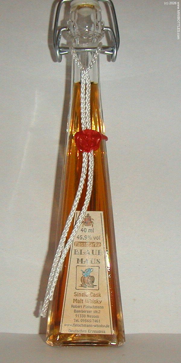 | Fleischmann Blaue Maus SM Whisky | | Manufacturer: | Fleischmann | City / State: Country: Continent: | Neuses / - Germany (DE) Europe |  | Age On Label: Alcohol: Content: | Unknown 45.00 % Vol. 4.00 cl | Bottle Style: Import: Whisk(e)y: | clear/other/- Original SMW - Single Malt Whisky