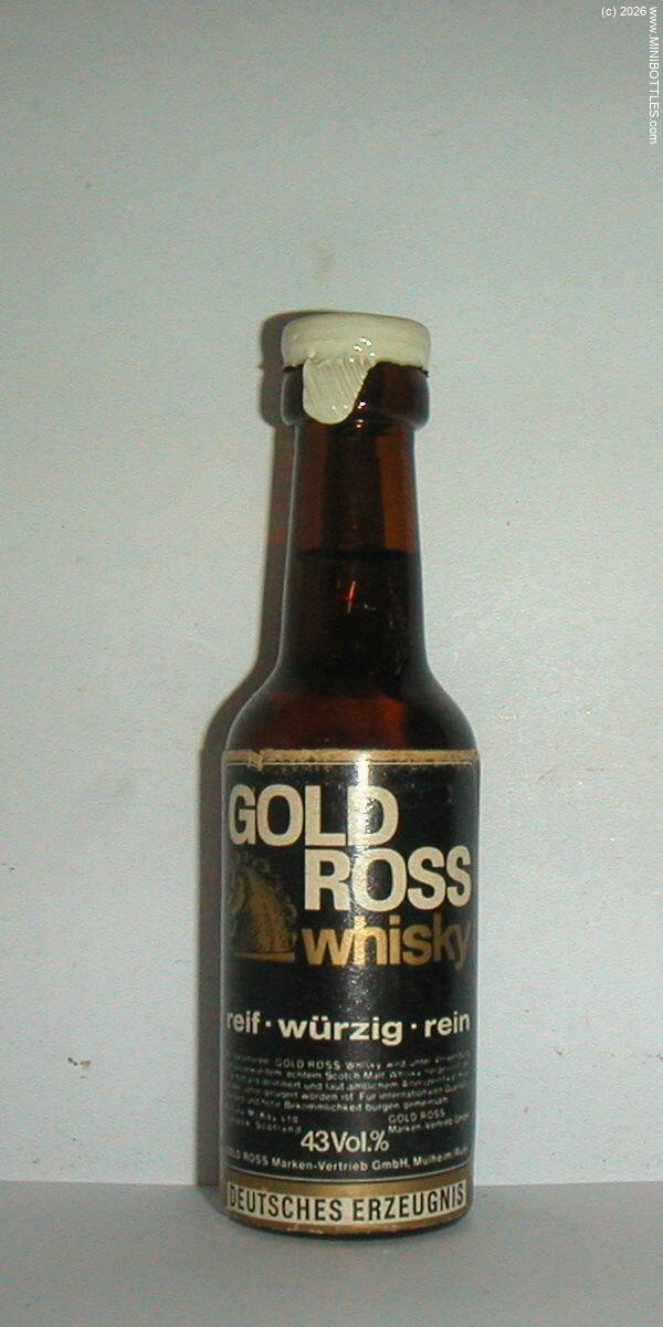 | Gold Ross Whisky - Reif Wuerzig Rein | | Manufacturer: | Gold Ross | City / State: Country: Continent: | Muelheim / - Germany (DE) Europe |  | Age On Label: Alcohol: Content: | Unknown 43.00 % Vol. 4.00 cl | Bottle Style: Import: Whisk(e)y: | brown/round/- Original Whisky