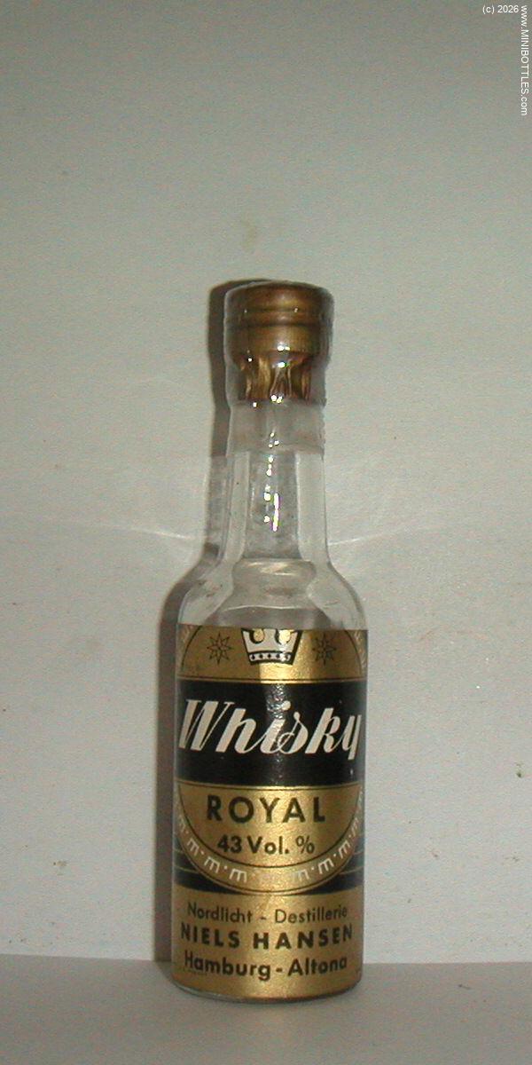 | Royal Whisky | | Manufacturer: | Nordlicht Destillerie | City / State: Country: Continent: | Hamburg-Altona / Hamburg Germany (DE) Europe |  | Age On Label: Alcohol: Content: | 4 years 43.00 % Vol. 4.00 cl | Bottle Style: Import: Whisk(e)y: | clear/round/- Original Whisky