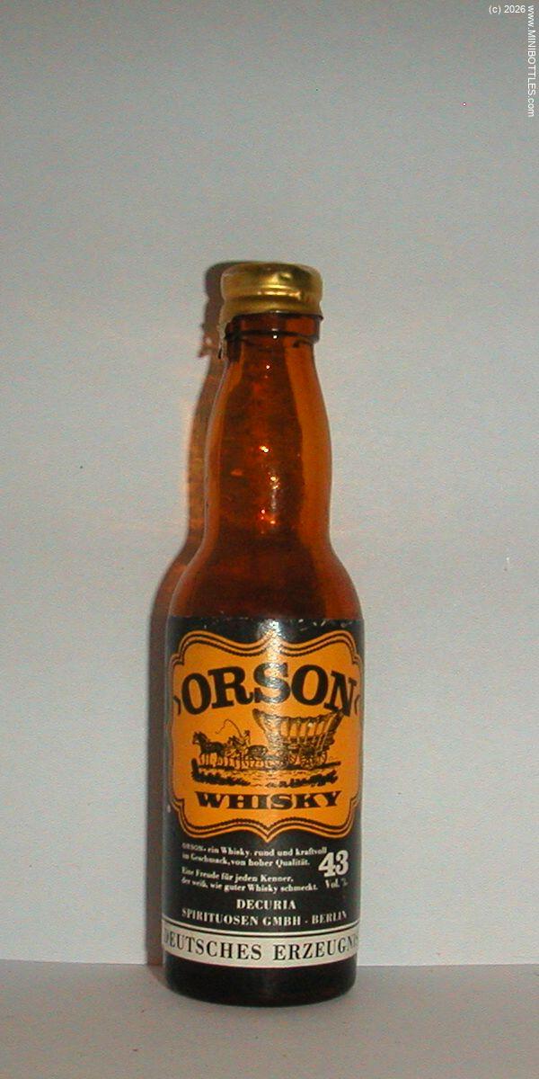 | Orson Whisky | | Manufacturer: | Decuria Spirituosen | City / State: Country: Continent: | Berlin / - Germany (DE) Europe |  | Age On Label: Alcohol: Content: | Unknown 43.00 % Vol. 4.00 cl | Bottle Style: Import: Whisk(e)y: | brown/round/- Original Whisky