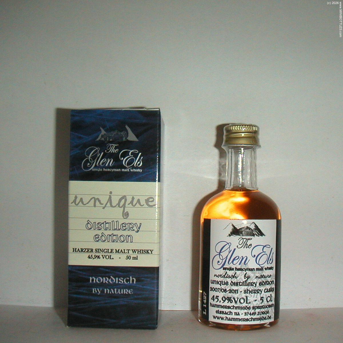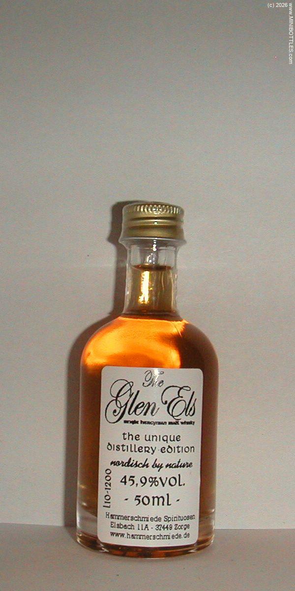 | The Glen Els Hercynian Single Malt Whisky | | Manufacturer: | Hammerschmiede Spirituosen | City / State: Country: Continent: | Zorge / - Germany (DE) Europe |  | Age On Label: Alcohol: Content: | Unknown 45.00 % Vol. 5.00 cl | Bottle Style: Import: Whisk(e)y: | clear/round/- Original SMW - Single Malt Whisky