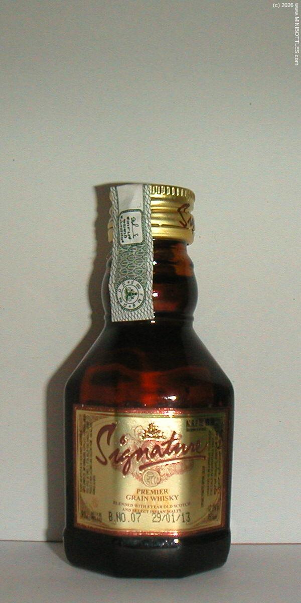 | Signature Premier Grain Whisky | | Manufacturer: | United Dist. | City / State: Country: Continent: | Bangalore / - India (IN) Asia |  | Age On Label: Alcohol: Content: | Unknown 42.00 % Vol. 9.00 cl | Bottle Style: Import: Whisk(e)y: | brown/other/- Original GW - Grain Whisky
